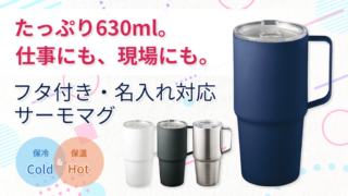 フタ付サーモトールマグ630ml ネイビーを、実際に使用した3名のレビュアー視点で詳しくレビュー。大容量630mlで保温性に優れ、フタ付きのため職場やスポーツ、屋外シーンでも安心して使える名入れ対応ノベルティです。サイズ感や使い勝手、重さの注意点、おすすめの業種・配布シーンまでBtoB向けに分かりやすく解説します。