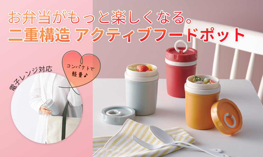 「二重構造 アクティブフードポット」は、電子レンジ対応・保温力・洗いやすさといった機能面に加え、性別や世代を問わず使いやすいデザインが魅力のアイテムです。汁物の持ち運びや温め直しができることで、日々の食事の悩みを解消し、ランチタイムの満足度を高めてくれます。