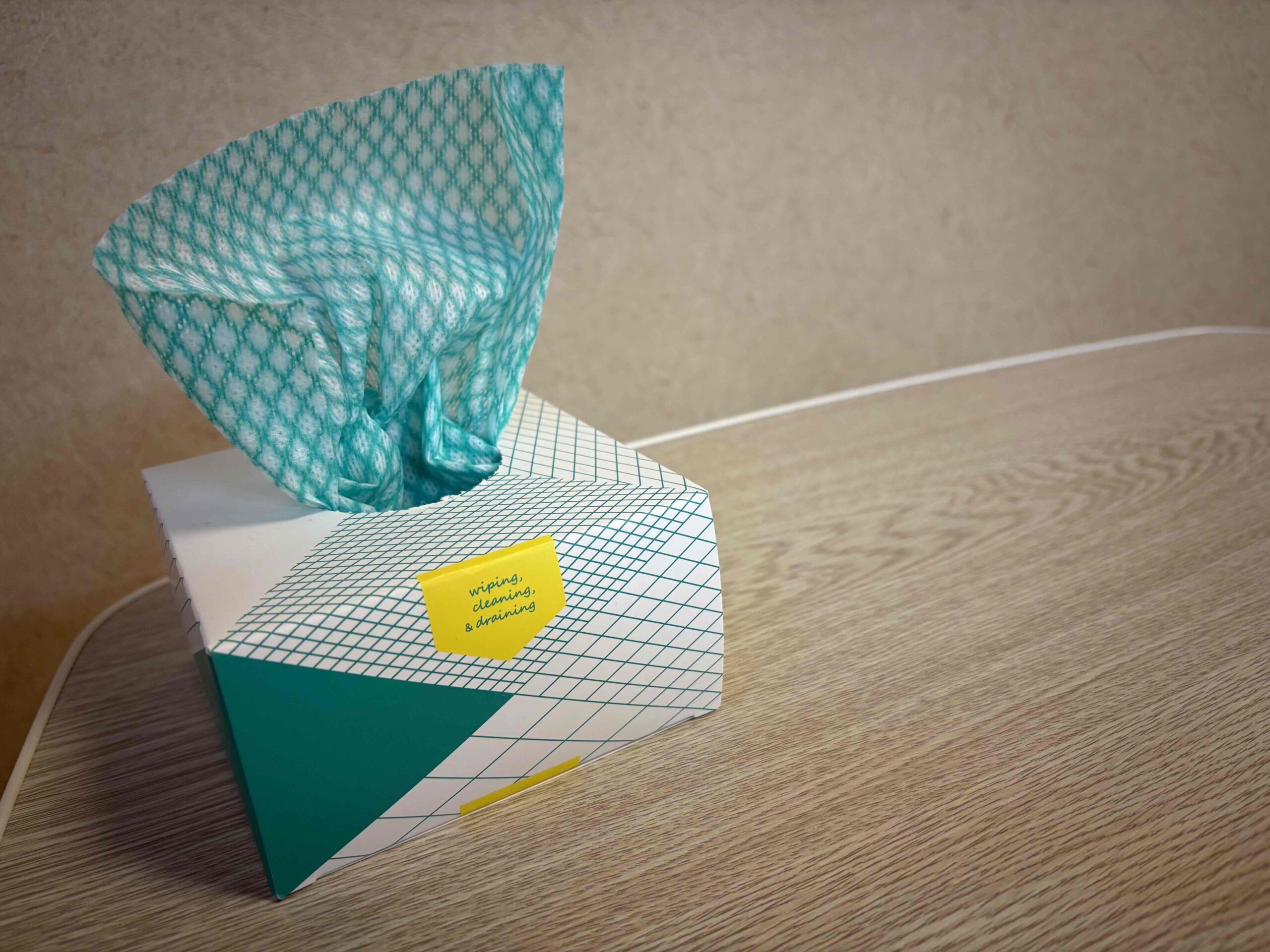 ボックスティッシュのように1枚ずつ取り出せて、キッチンや洗面所、デスク周りなど、さまざまな場所で活躍します。シンプルで清潔感のあるデザインが魅力。