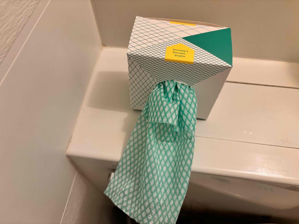 特に気に入ったのは、ボックスティッシュのようにすぐ取り出せる手軽さ。気になったときにサッと使えるので、キッチンの油汚れや洗面台の水滴、テレビ台のホコリなど、これまで見て見ぬふりをしていた汚れにもすぐ対応できるようになりました。