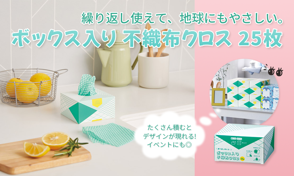 「ボックス入り 不織布クロス 25枚」は、使いやすいノベルティです。サイズ感もちょうど良く、使い勝手も抜群。キッチンや掃除など、日常のさまざまなシーンで活躍してくれます。