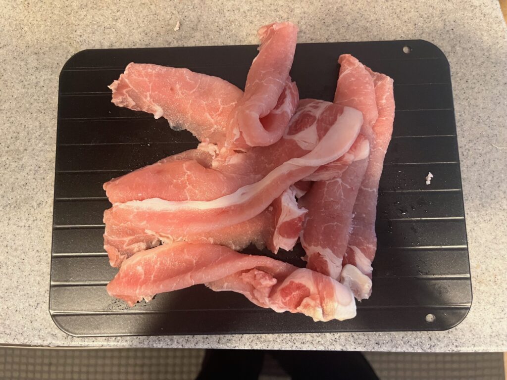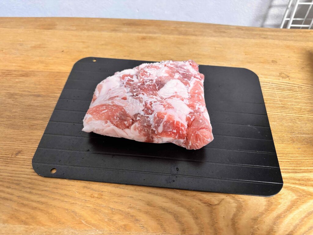 お肉は買いだめして小分け冷凍しているので、毎回解凍が必要です。自然解凍では芯が残るし、レンジでは周りが焼けたように変色してしまうことも…。でもこのプレートを使ってみて驚きました。芯までしっかり解凍できるんです!