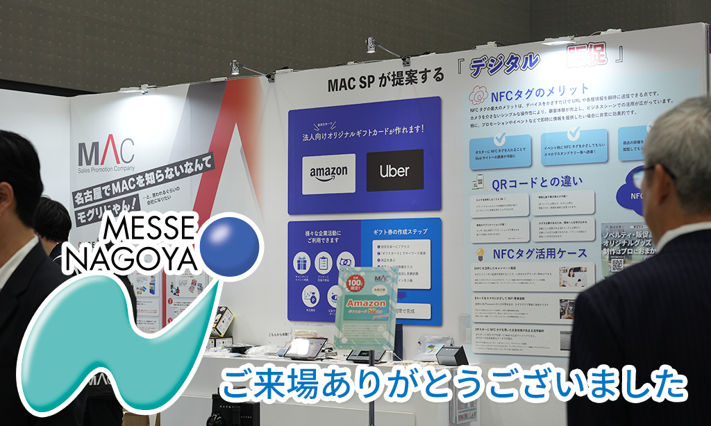 今回の展示会では『デジタル×販促』をテーマに、「ギフトカード」「NFCタグ」を展示させていただきました。ブースには、以前の展示会でもご紹介した「GiftS(ギフツ)」や実際に制作したノベルティも展示。