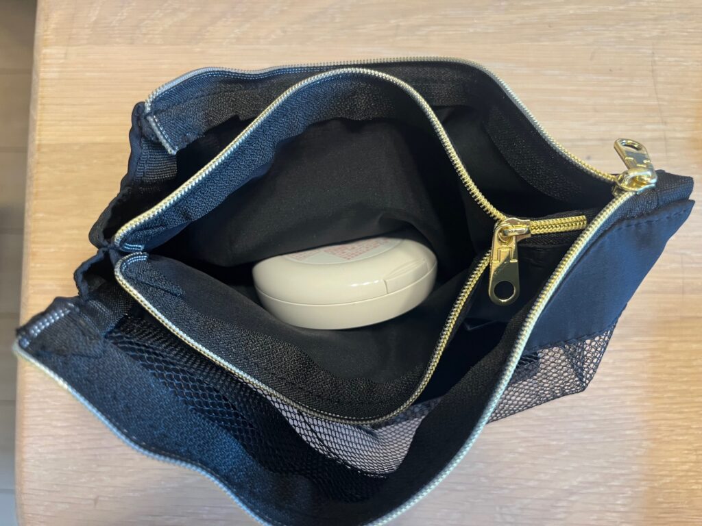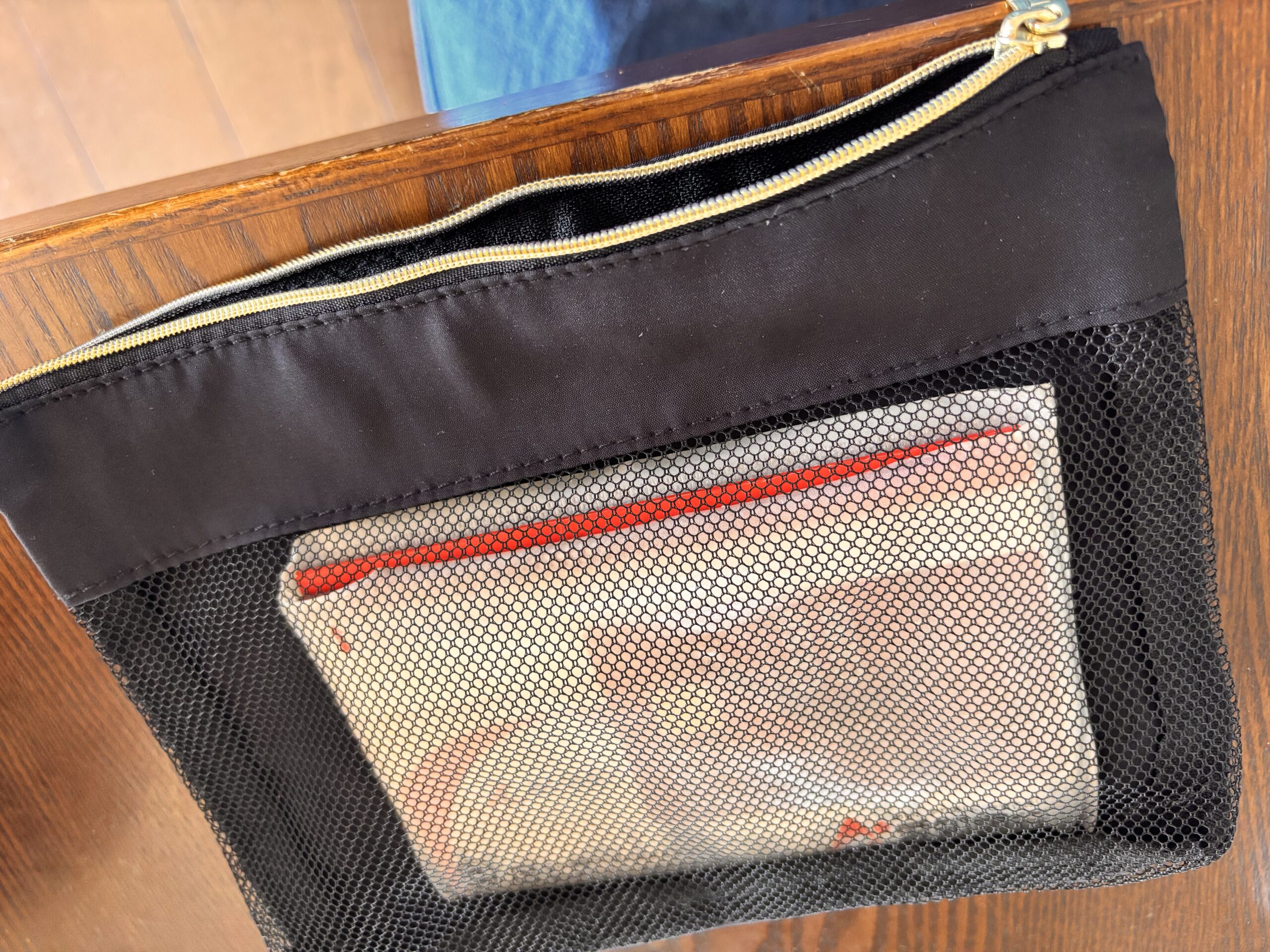 ポーチはこれまで色々使ってきましたが、今回のような少し変わった構造のものは初めてです。表面はメッシュ素材で中身が見えるので、何が入っているか一目でわかります。さらに、ファスナー付きの小さめスペースがあり、一番大きなスペースには内ポケットも。生地はしっかりタイプではないですが、マチもあって収納力があります。