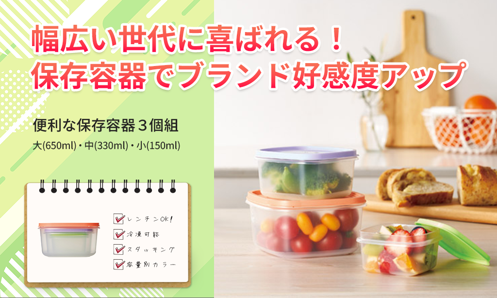 食品関係の企業や試食イベントなど、幅広い業種のノベルティとしておすすめ。世代や性別を問わず使えるので、万人に喜ばれる実用的な保存容器セットだと思います。