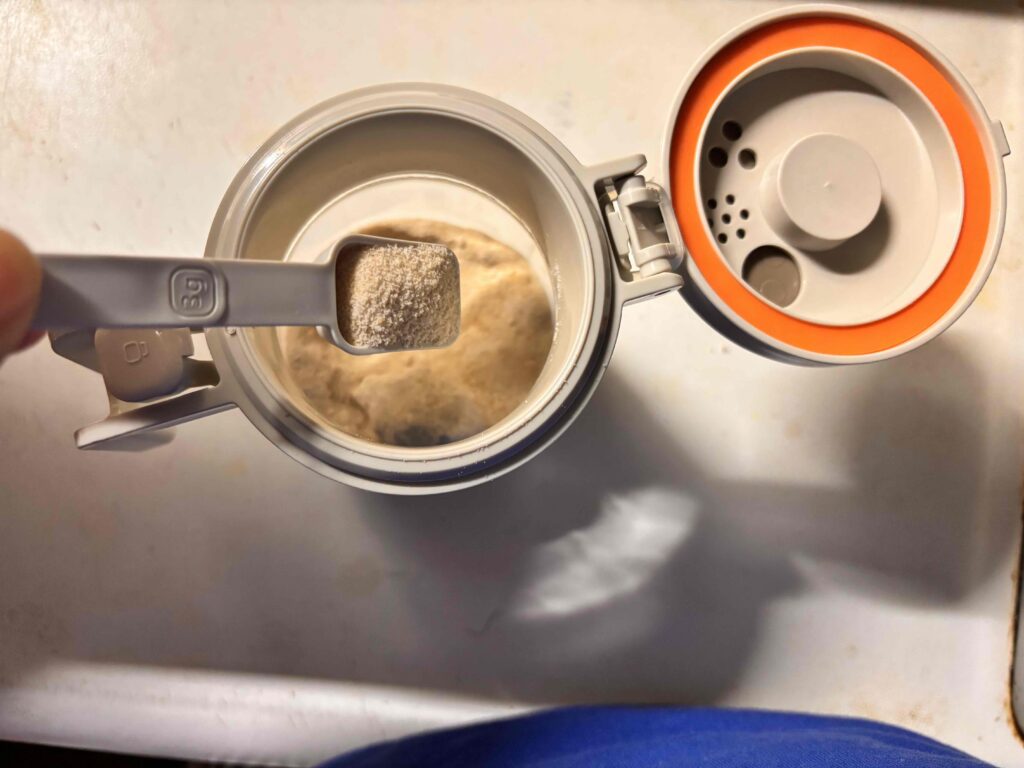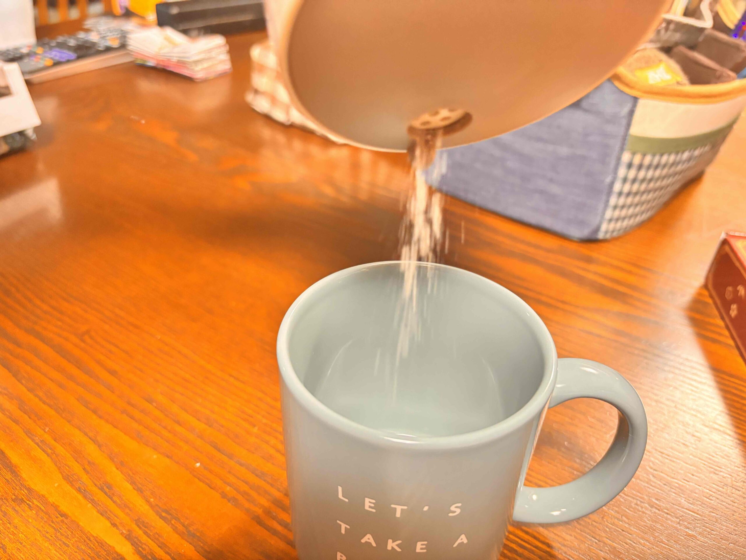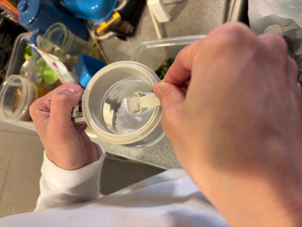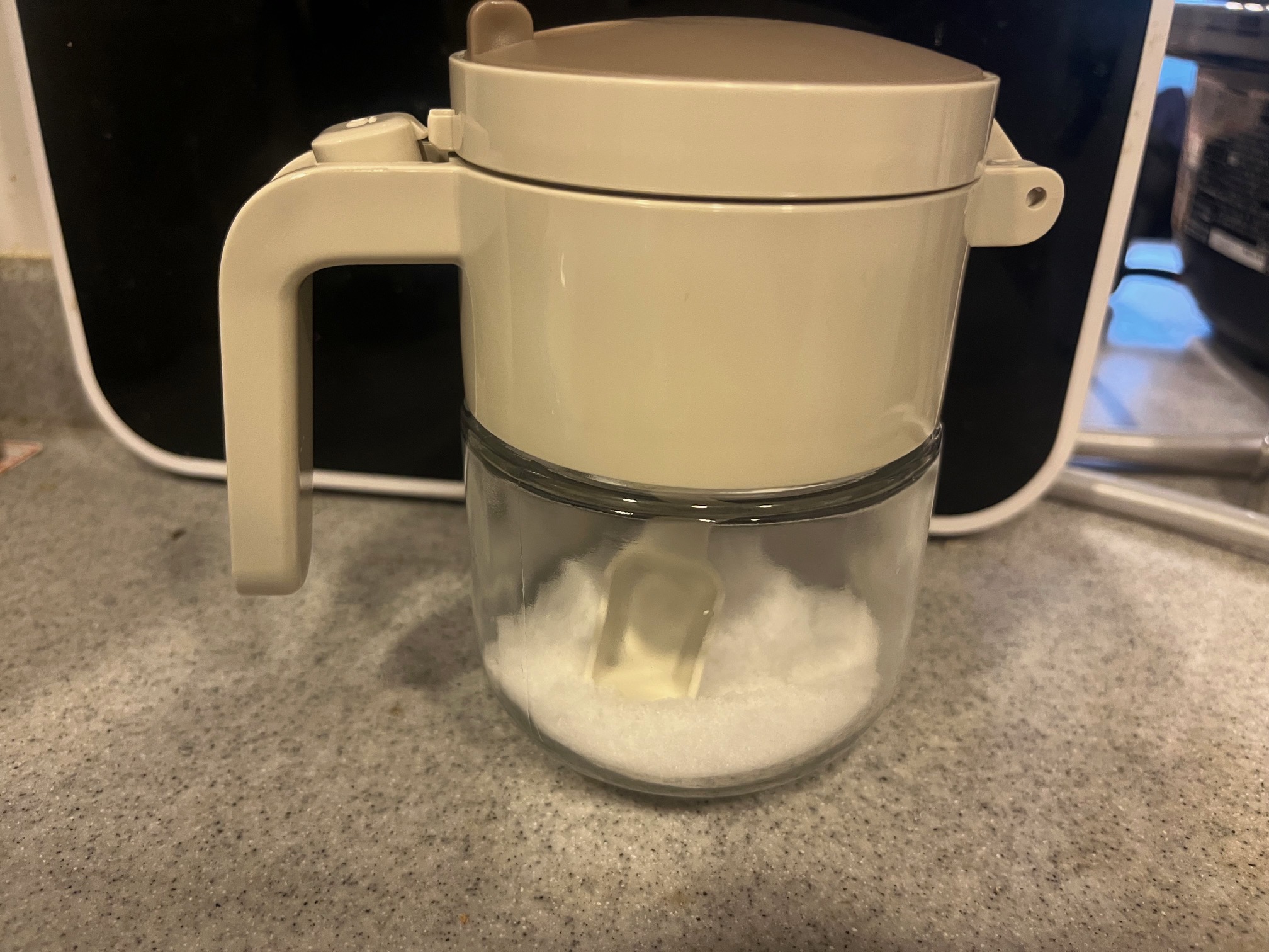 実際に砂糖を入れてみると、しっかり蓋が外れるので入れやすく、上部の蓋を回すと振りかけて使える仕様に感動しました。砂糖は少ししっとりしていて穴から出にくいものの、専用スプーンが付いていてすくいやすいのもポイント。片手で操作できるのは本当に便利です。さらに、蓋が外れるので洗いやすく、衛生面も安心。