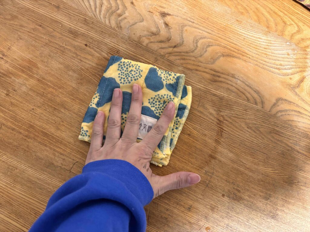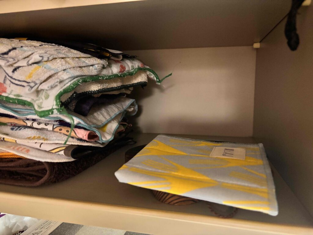 素材はかや織りで、透けるような粗めの平織りが特徴。丈夫で耐久性があり、使うほど柔らかくなるうえ、速乾性と吸水性にも優れています。洗えばすぐきれいになり、乾きも早いので毎日使いやすいです。サイズも程よく、子どもの手にもぴったり。孫にテーブル拭きを手伝ってもらえたのは嬉しいポイントでした。