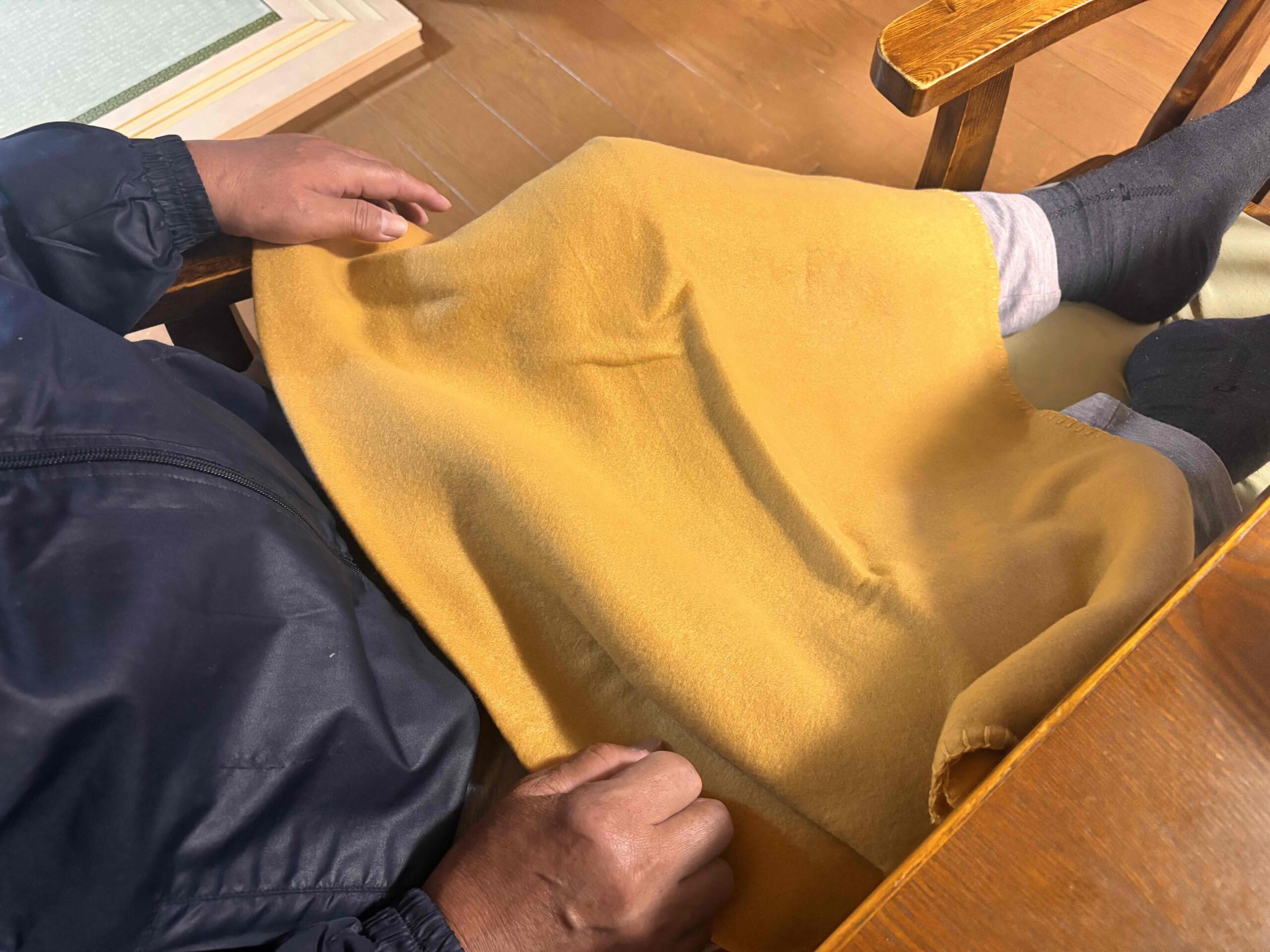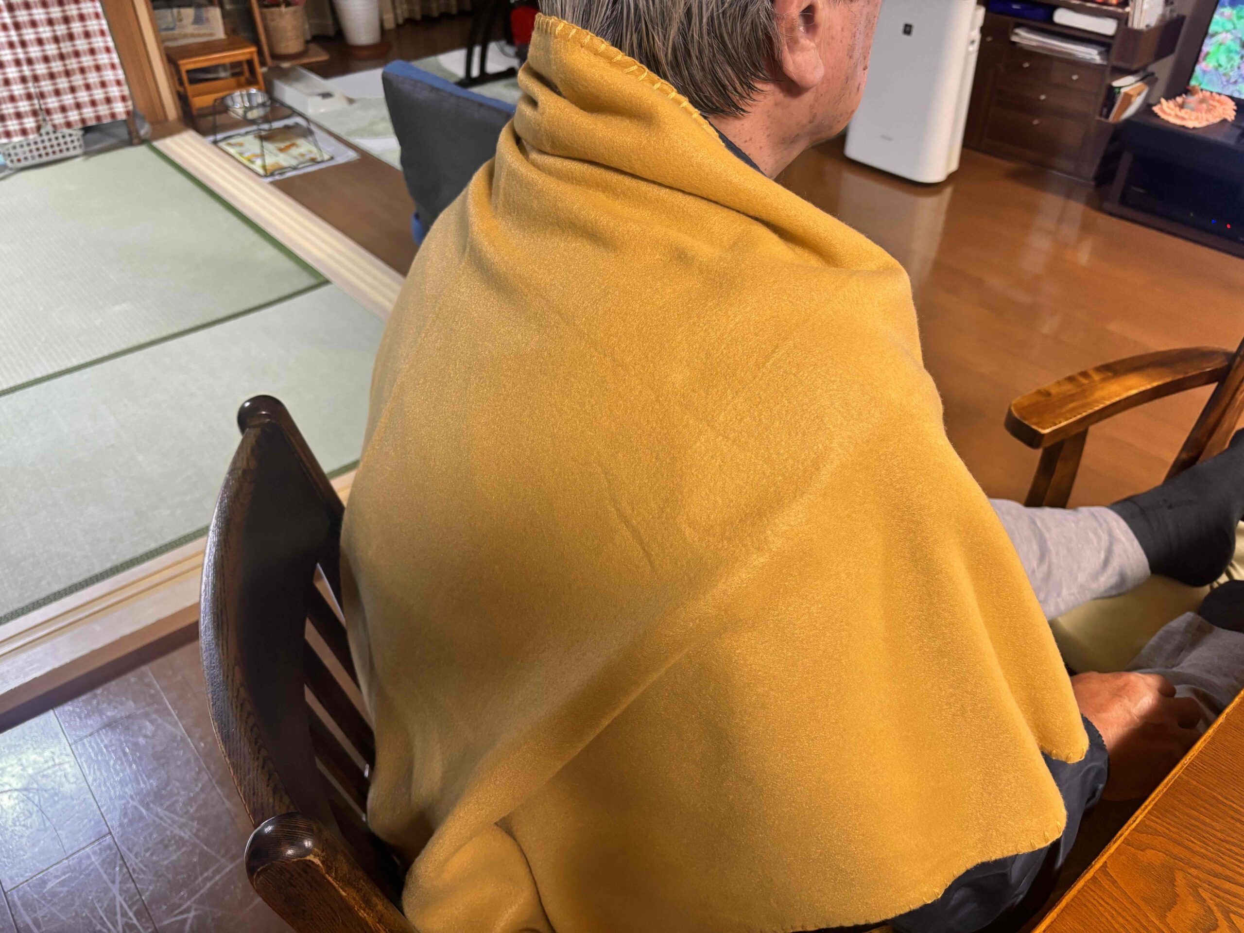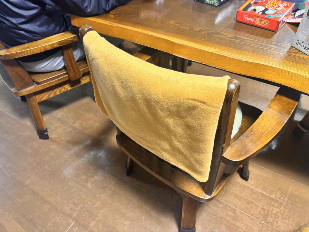 「せめて朝食をとるダイニングで、サッと使える膝掛けがあれば…」と思っていた矢先、偶然ノベルティとしていただいたのがウォームラージブランケットです。試しに使ってみたところ、真冬の寒い時期に重宝するアイテムとなりました。