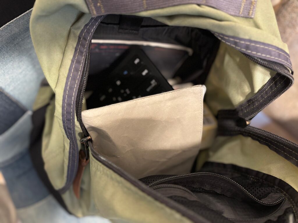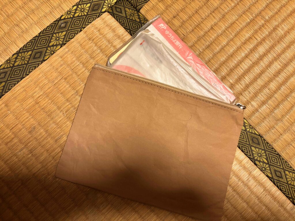ウォッシャブルペーパーを使ったポーチを手にしたのは今回が初めてで、「こんな手触りのポーチがあるんだ!」とまず素材感に衝撃を受けました。植物由来の耐水性クラフト紙で作られた“ウォッシャブルペーパー”は、紙のような見た目なのに水洗いができるエコ素材。軽くて丈夫で、環境にも優しい点が印象的です。
