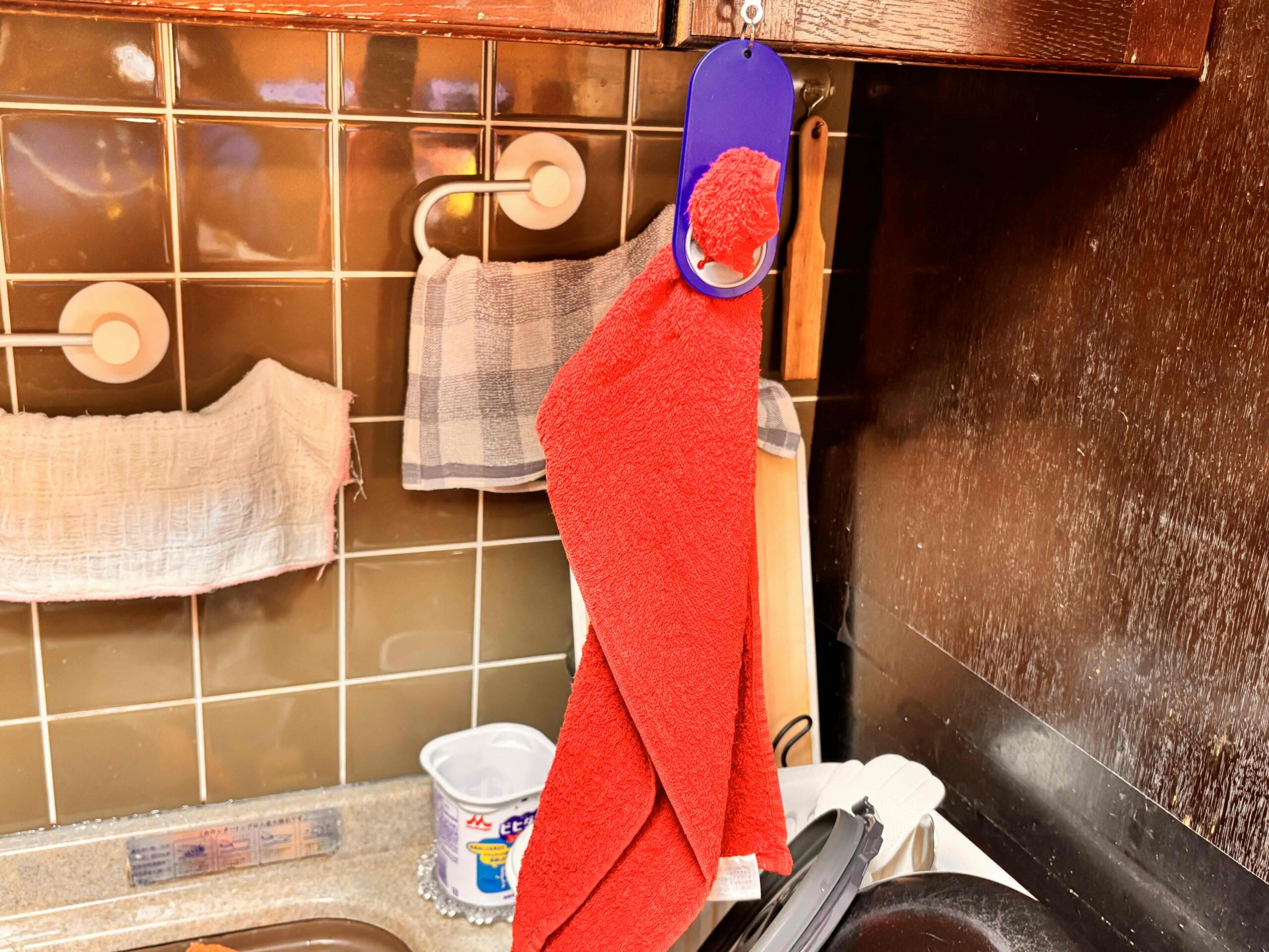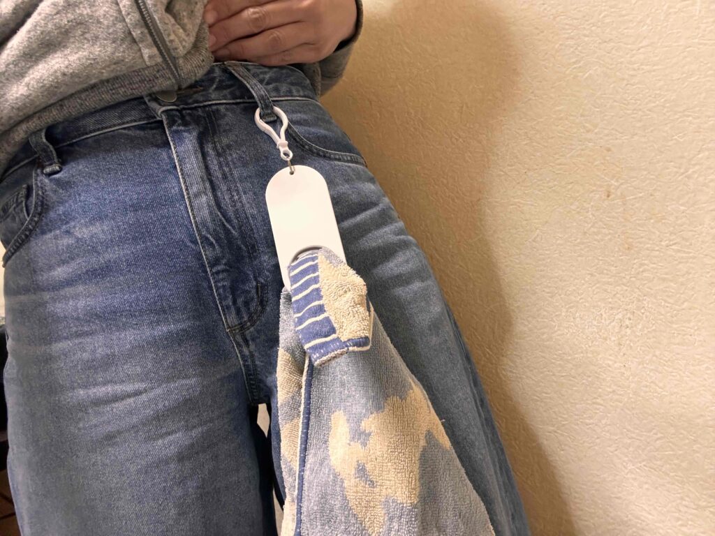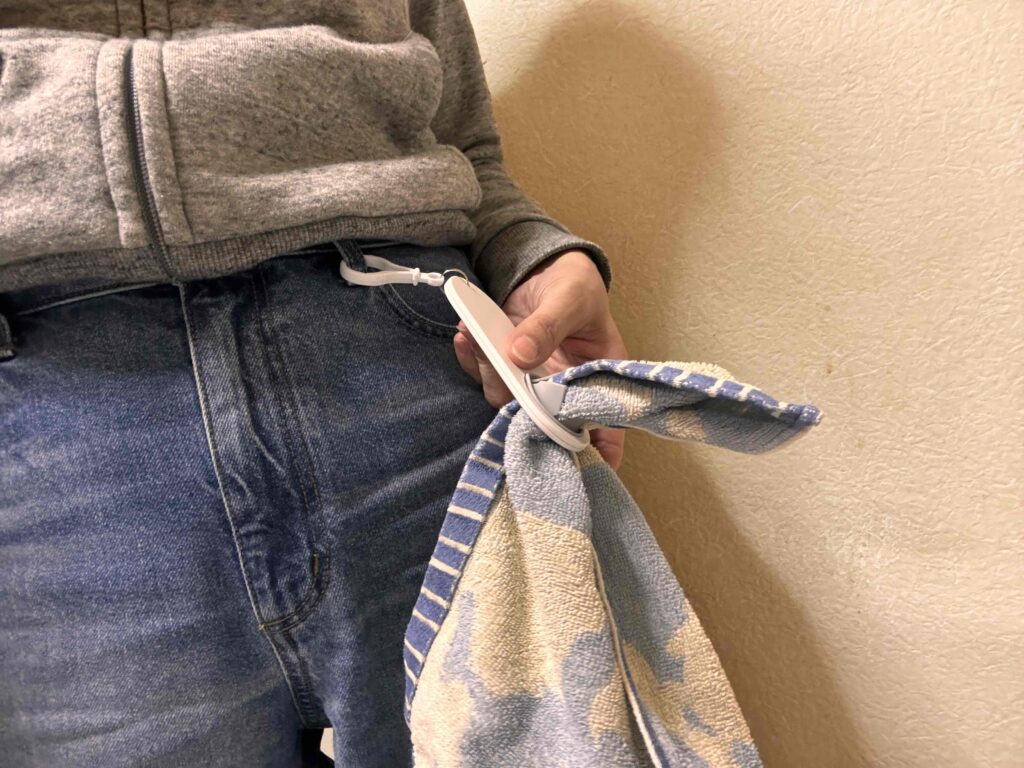 また、掃除の時にズボンのベルト通しに付けて使えば、汗を拭きたいタイミングですぐ使えるのも便利です。さらに、台所に吊るして“自分専用タオル”として使うという活用方法も気に入っています。シリコンの固定力がしっかりしているため、1度タオルをセットすると持ち運びにも安心です。