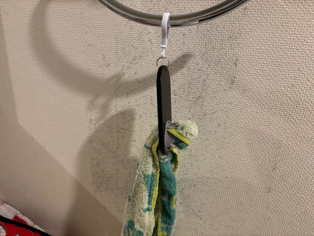 さらに気に入ったのは、室内での使い勝手の良さです。洗面所のタオルバーやフック、タオルリングのような場所にも簡単に吊るせます。シリコン部分の切り込みにタオルを押し込むだけという簡単な構造ですが、保持力はしっかり。やや強めに引っ張って拭いても抜け落ちず、交換したいときはスムーズに外れるという、絶妙なバランスで設計されています。