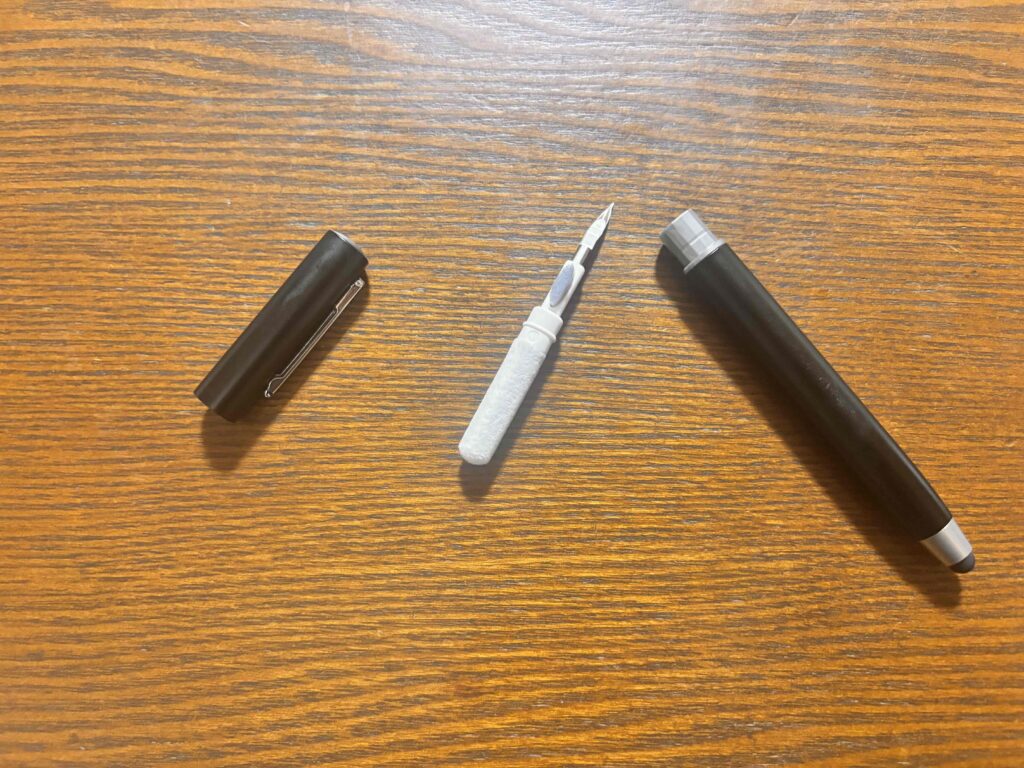 最初にこの商品を手に取った時、タッチペン付きのボールペンかと思いました。しかしキャップを外してみると、万年筆のようなペン先が現れ、「これはなんだ?」とちょっと不思議に。説明書を見て、ようやくその正体が“イヤホンクリーナー付タッチペン”であることがわかりました。