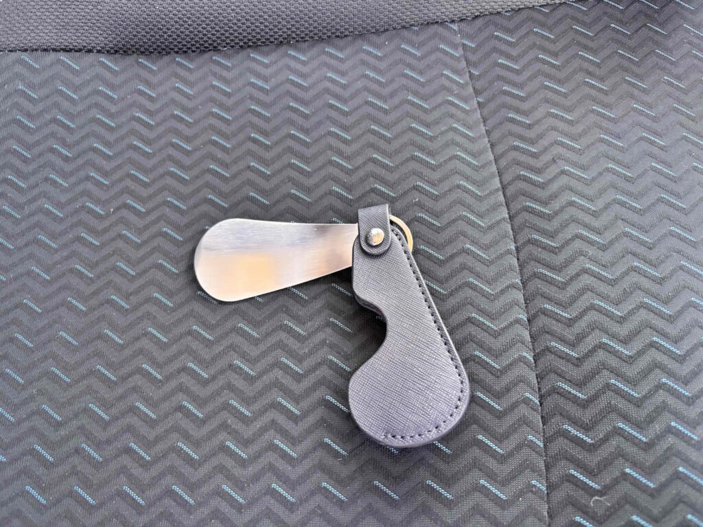 ステンレス製なので汚れにくく、破損しにくいのもポイント。除菌シートなどでサッと拭けば簡単に清潔にできるため、足元に使うアイテムとして安心して持ち歩けます。よくあるプラスチック製の靴べらと比べても耐久性が高く、長く愛用できると感じました。